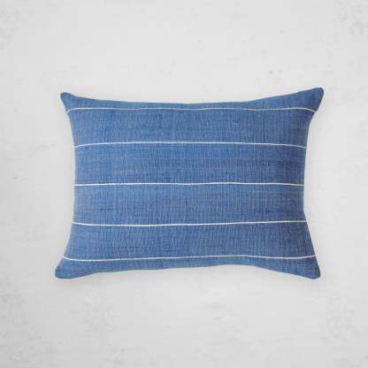 Simple stripes run through this bold little pillow.? A natural cotton warp and deep blue weft give it a denim-like appearance, just perfect for that blue-themed room you're planning!
